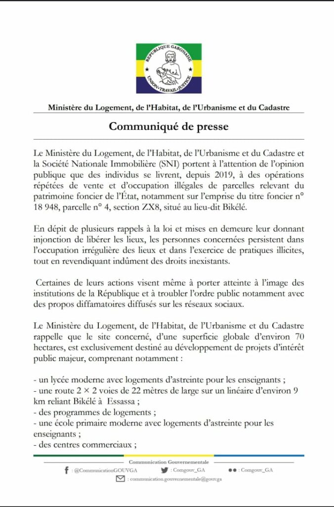 Le Ministère du Logement, de l’Habitat, de l’Urbanisme et du Cadastre est l’institution gouvernementale chargée de concevoir, mettre en œuvre et suivre les politiques publiques relatives au logement, à l’aménagement urbain, à l’habitat et à la gestion foncière au Gabon.
